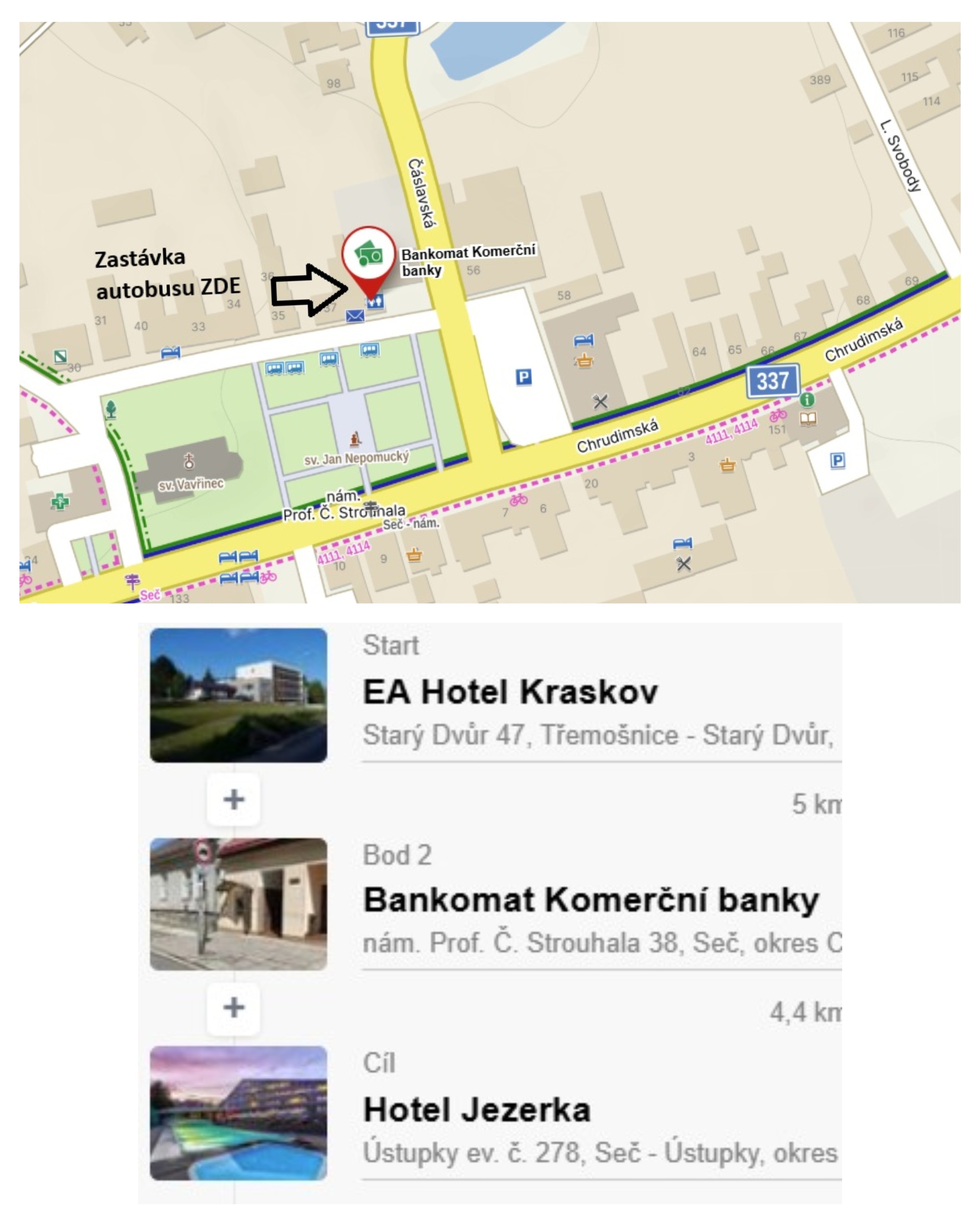 Ubytované v Obci Seč vyzvedne autobus cestou z hotelu Kraskov na hotel Jezerka. (mapa viz níže)